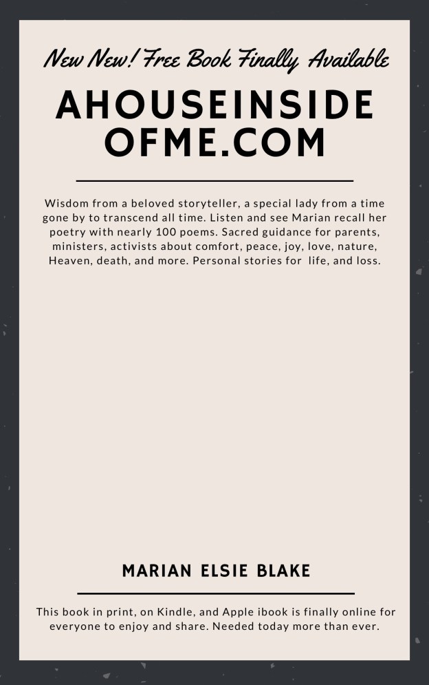 Recently, with my son’s help, we put my mother’s poetry online for everyone to see and listen to as my mom was videotaped reading some of her poetry. This is our free gift to all of you. Simply go to ahouseinsideofme.com and in the Table of Contents look for those poems marked (video) to see and hear Marian Elsie Blake in person.