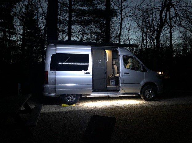As I examined the wooded setting of Airy the RV in the photo above, I found pleasure in the breaking of dawn through the trees, as well as in the lit underbelly of the coach. Both types of lighting touched my mind’s eye and I asked why? One light protected me near the the RV, while the other protected my early morning drive from deer leaping, or hikers walking.